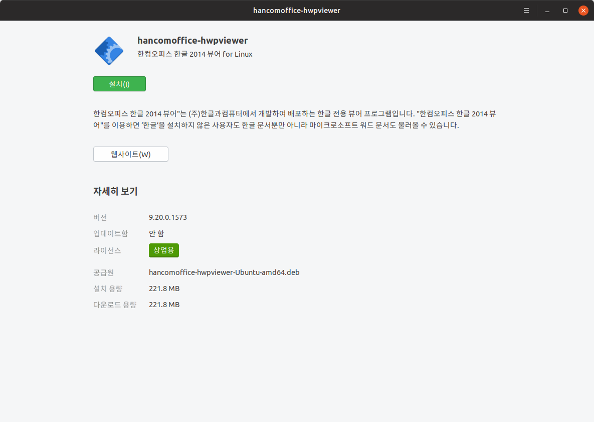 해당 파일을 더블 클릭하면 우분투 소프트웨어 센터가 자동으로 활성화되면서 설치가 진행된다.