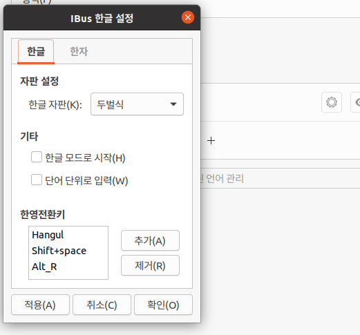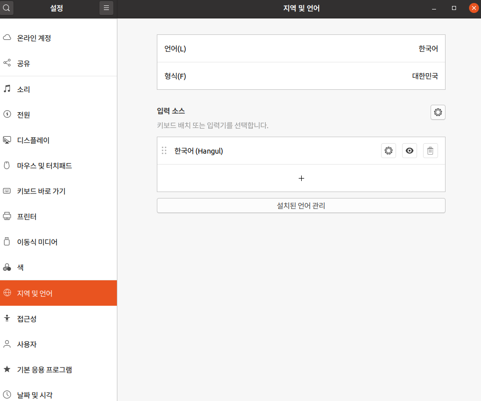 기본 설치할 때 English(US) 로 했으면 입력소스에 English랑 한국어가 둘 다 있는데, 한국어만 남겨놓자.