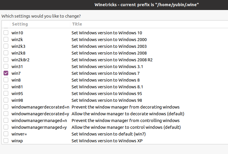 winetricks 실행 후 select default wineprefix의 change setting 에서 win7로 바꿔주면 된다.